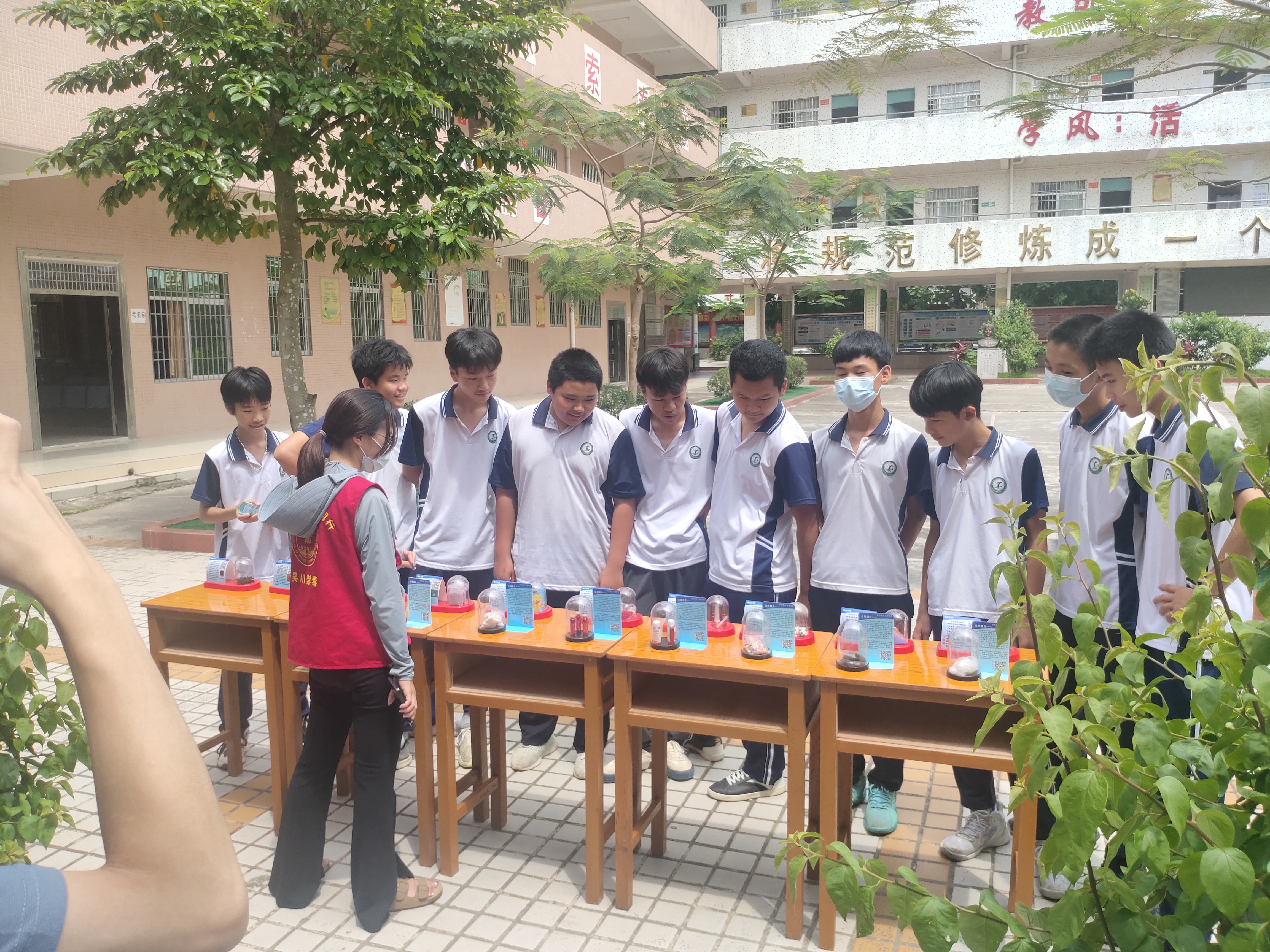 在校园广场设立宣传展示平台,通过设置反邪教、扫黑除恶、禁毒、民法典宣传展板,现场学生们发放各类法治宣传单张、展示禁毒仿真模具、悬挂宣传横幅等多种渠道,向广大师生普及反邪教、扫黑除恶、禁毒法律法规,用通俗易懂的语言为学生们讲解相关预防违法犯罪技巧等,提醒他们要筑牢思想防线,提高自我安全保护意识。