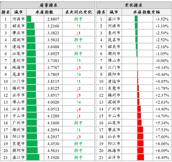 城市排名:基于270个省考断面水质监测结果,按照城市水质指数由低到高排名,全省水环境质量前三名为河源、韶关和肇庆市,后三名由高到低为湛江、揭阳和东莞市。湛江、河源和惠州等7市水环境质量同比有所改善,云浮、珠海和阳江等14市同比有所下降。