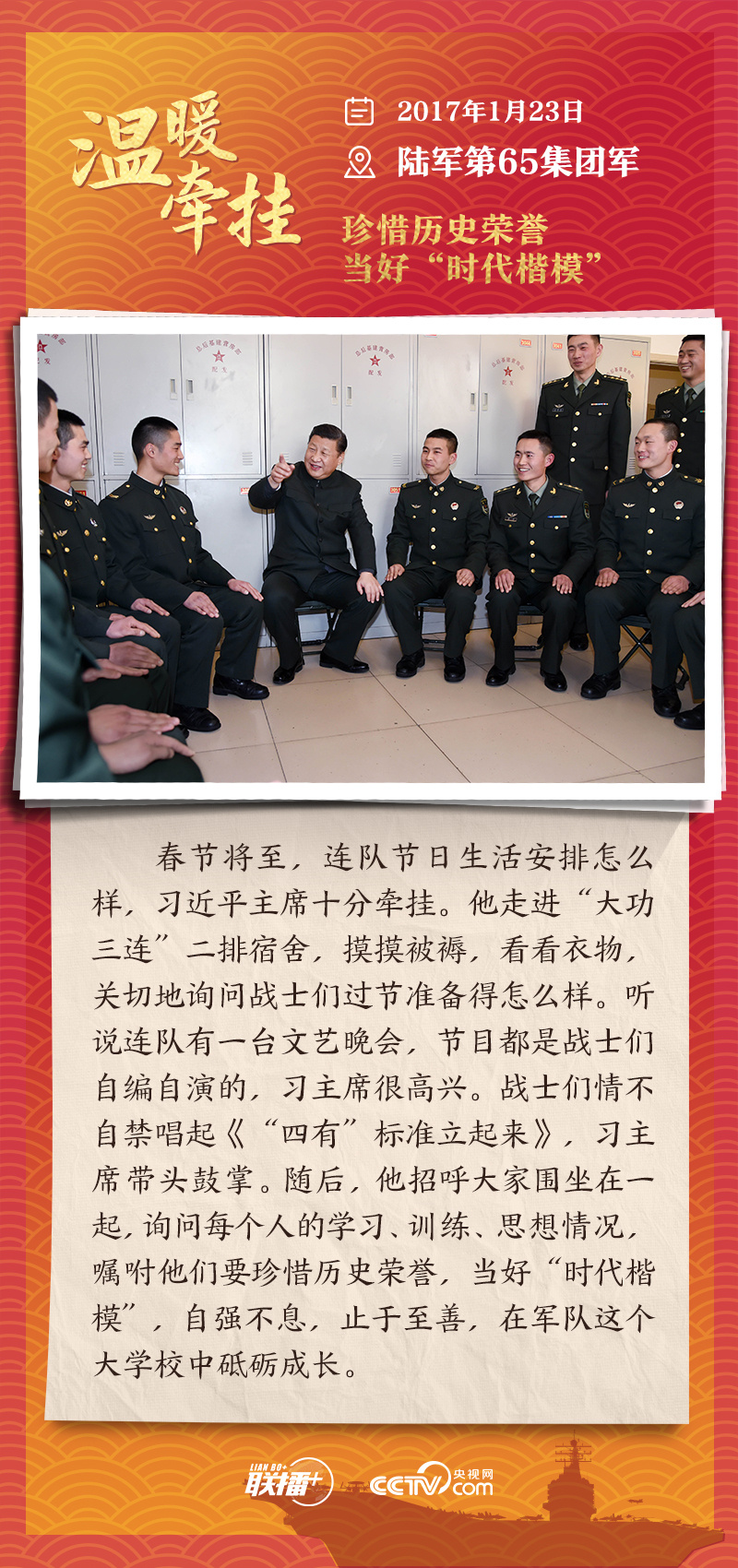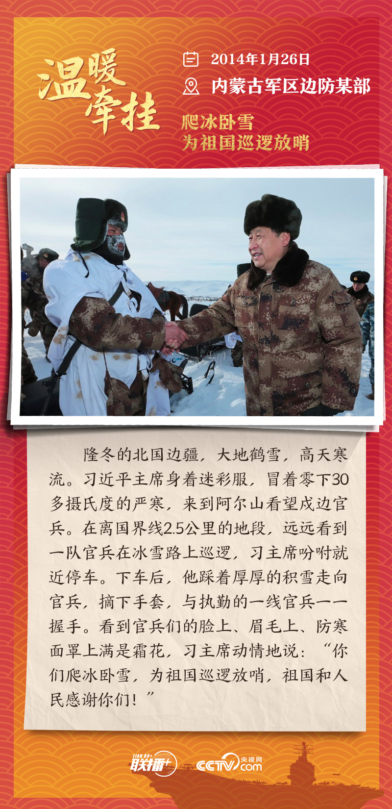 踏边关、走戈壁、入班排、看哨所……党的十八大以来,每逢新春佳节到来之际,即使行程再满,习近平主席也会留出时间来到军营、训练场或边防线,看望或亲切接见驻地部队官兵,代表党中央和中央军委,向全体人民解放军指战员、武警部队官兵、民兵预备役人员致以诚挚问候和新春祝福。
